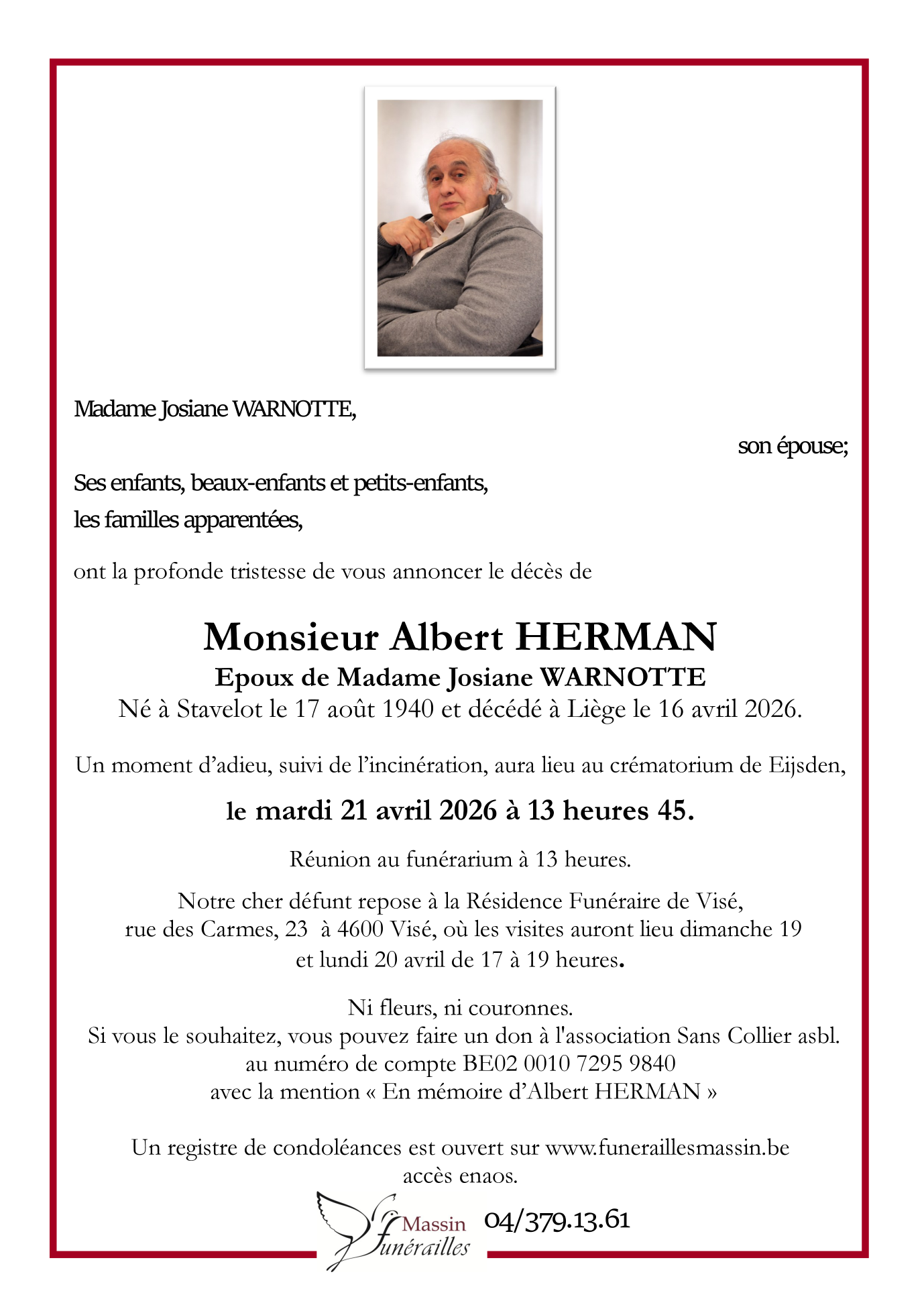 Crematorium de Eijsden demain, mardi 21 avril à 14 heures 15