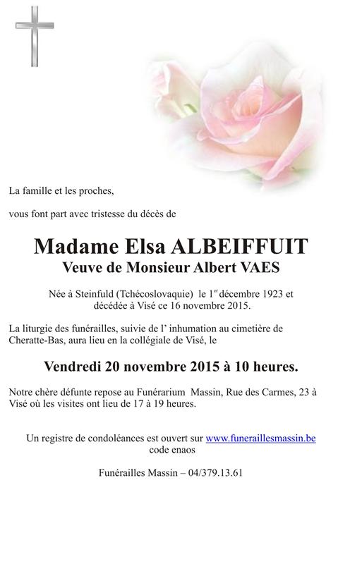 Décédée à Visé (4600) le lundi 16 novembre 2015 à l'âge de 91 ans