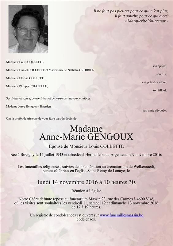 Décédée à Hermalle-sous-Argenteau (4681) le mercredi 9 novembre 2016 à l'âge de 73 ans
