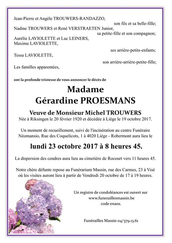 Décédée à Liège (4000) le jeudi 19 octobre 2017 à l'âge de 97 ans