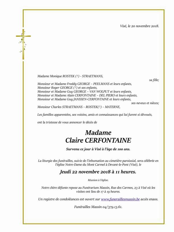 Décédée à Visé (4600) le mardi 20 novembre 2018 à l'âge de 100 ans