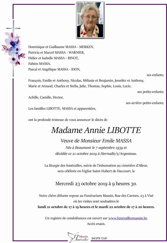 Décédée à Hermalle-sous-Argenteau (4681) le lundi 21 octobre 2019 à l'âge de 80 ans