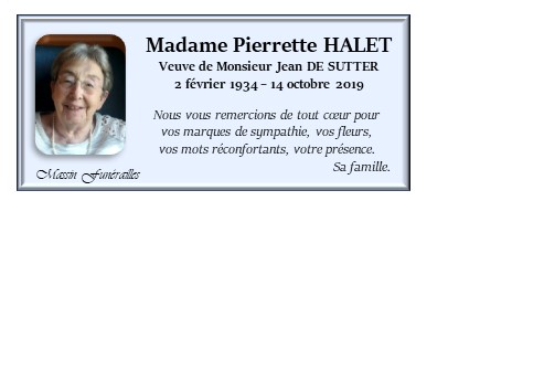 Décédée à Oupeye (4680) le lundi 14 octobre 2019 à l'âge de 85 ans