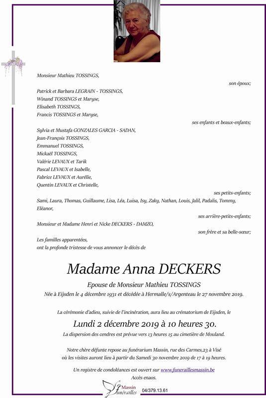 Madame Anna DECKERS Epouse Mathieu Tossings
