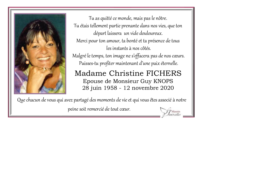 Décédée à Hermalle-sous-Argenteau (4681) le jeudi 12 novembre 2020 à l'âge de 62 ans