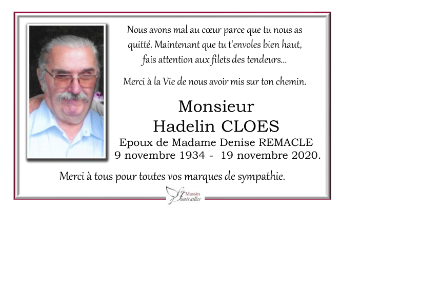 Décédé à Hermalle-sous-Argenteau (4681) le jeudi 19 novembre 2020 à l'âge de 86 ans