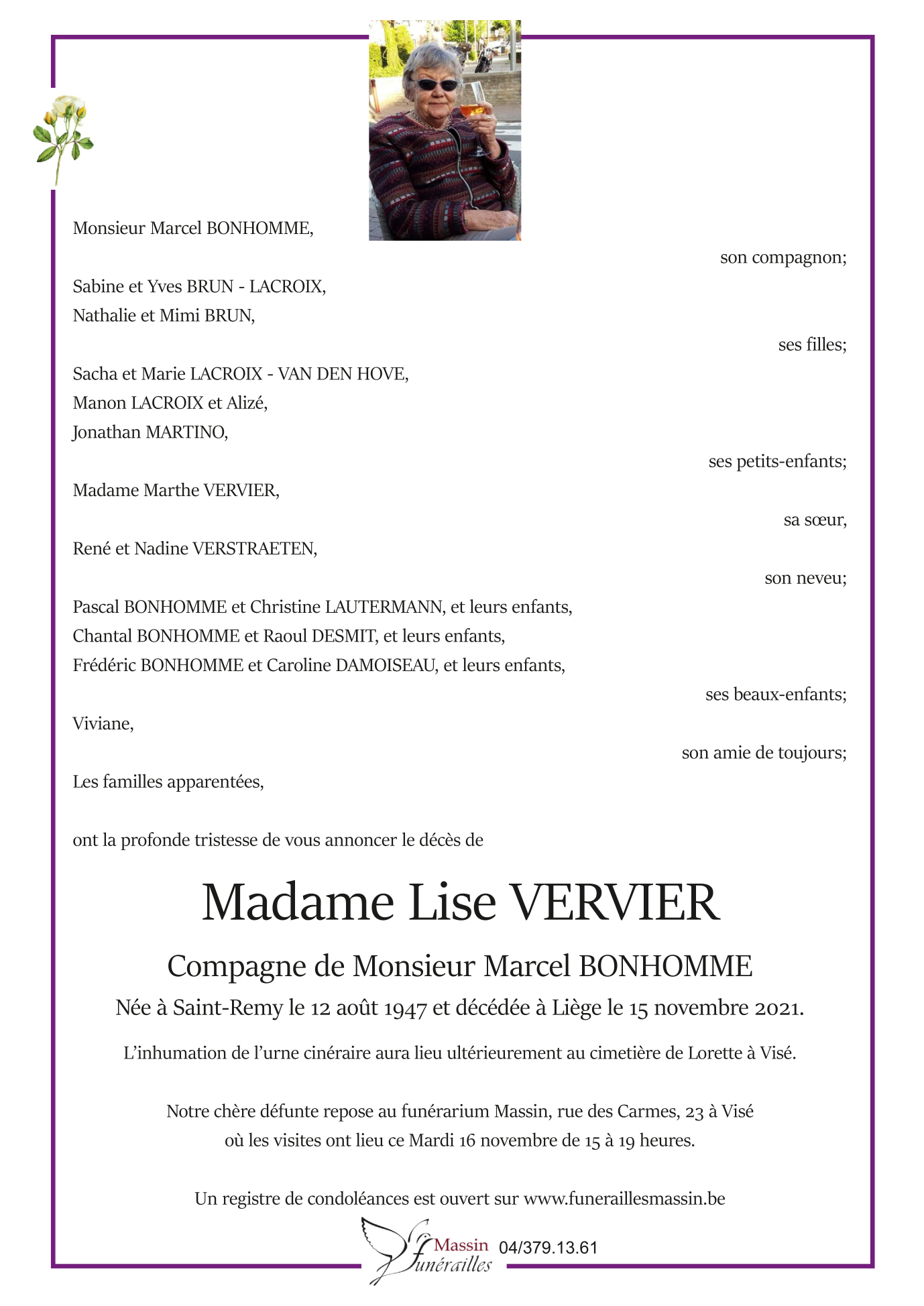 Décédée à Liège (4000) le lundi 15 novembre 2021 à l'âge de 74 ans