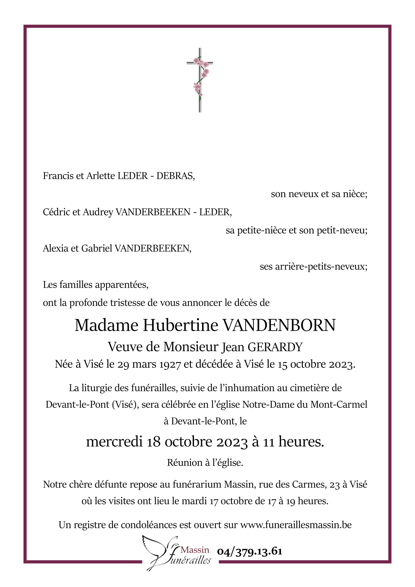 Décédée à Visé (4600) le dimanche 15 octobre 2023 à l'âge de 96 ans