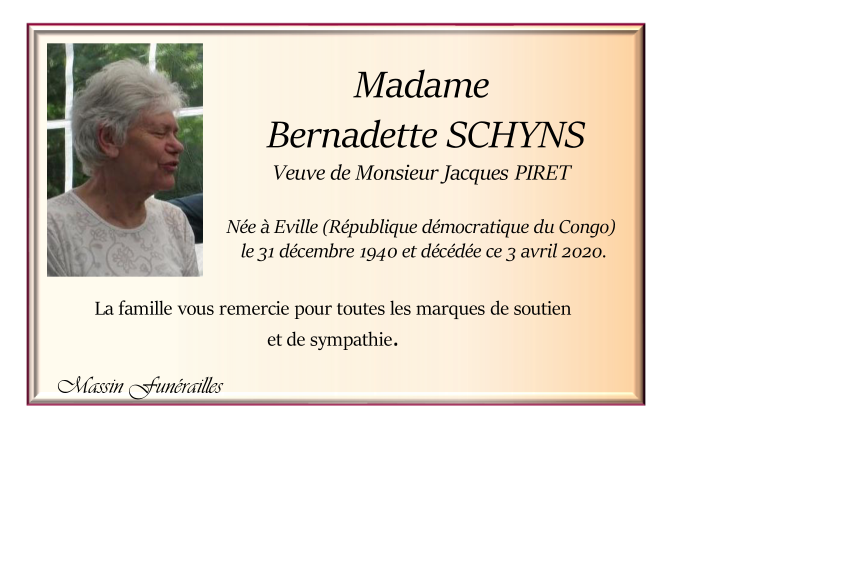 Madame Bernadette SCHYNS Vve de Jacques PIRET