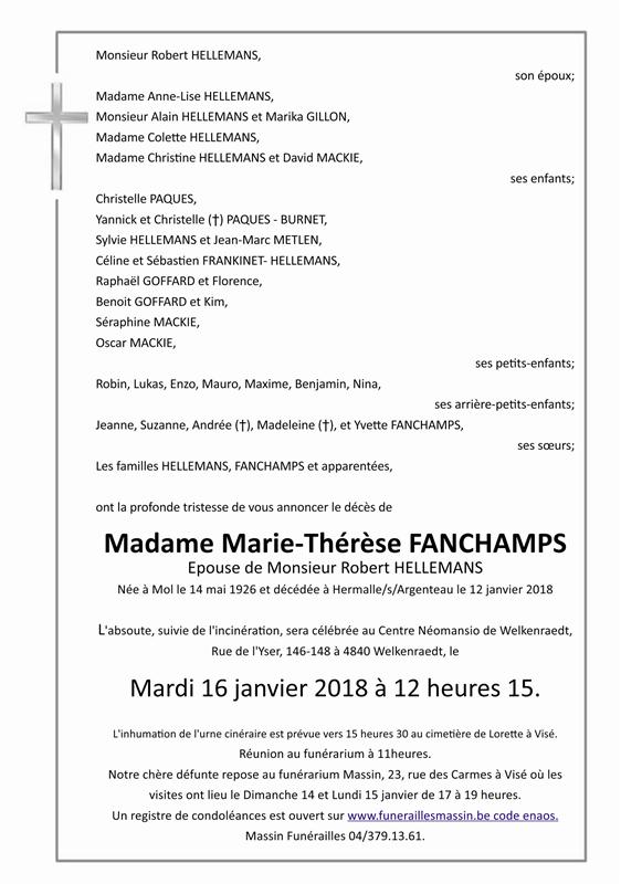 Madame Marie-Thérèse HELLEMANS née FANCHAMPS