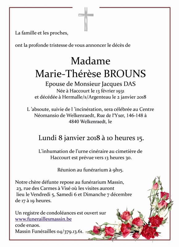 Décédée à Hermalle-sous-Argenteau (4681) le mardi 2 janvier 2018 à l'âge de 86 ans