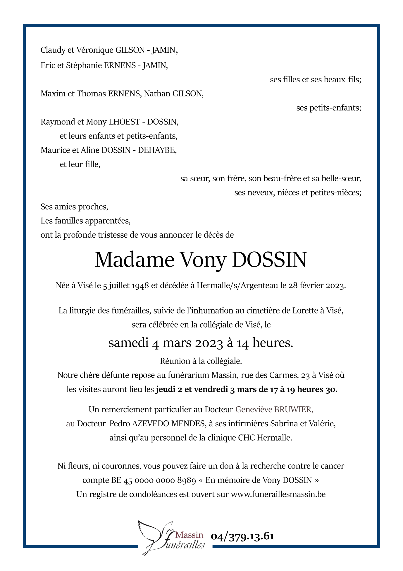 Décédée à Hermalle-sous-Argenteau (4681) le mardi 28 février 2023 à l'âge de 74 ans