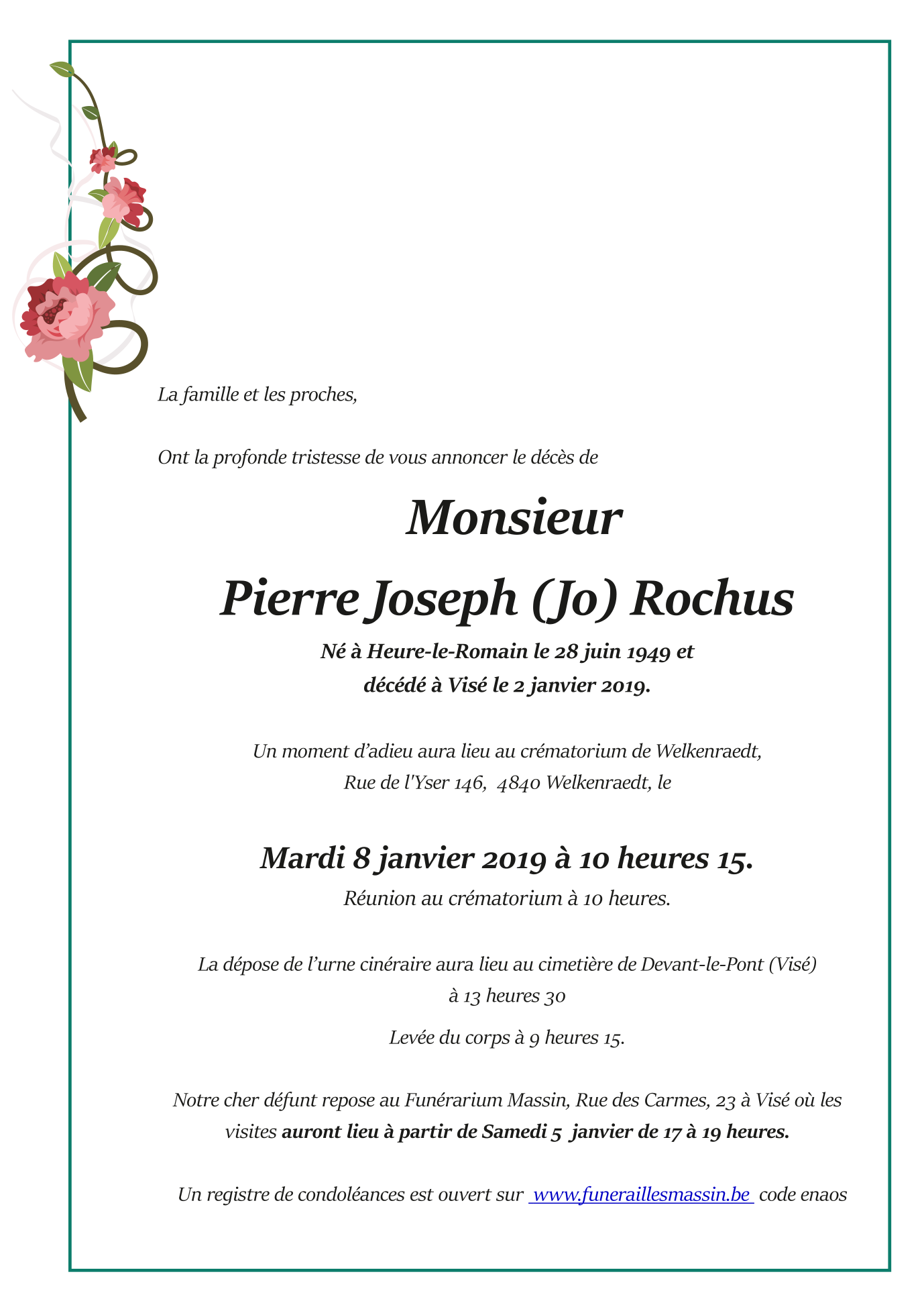 Décédé à Visé (4600) le mercredi 2 janvier 2019 à l'âge de 69 ans