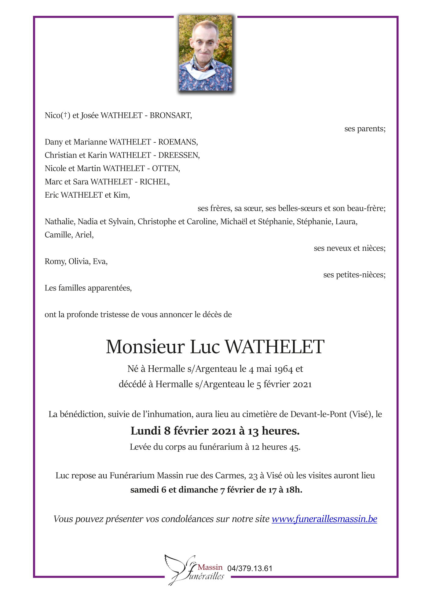Décédé à Hermalle-sous-Argenteau (4681) le vendredi 5 février 2021 à l'âge de 56 ans