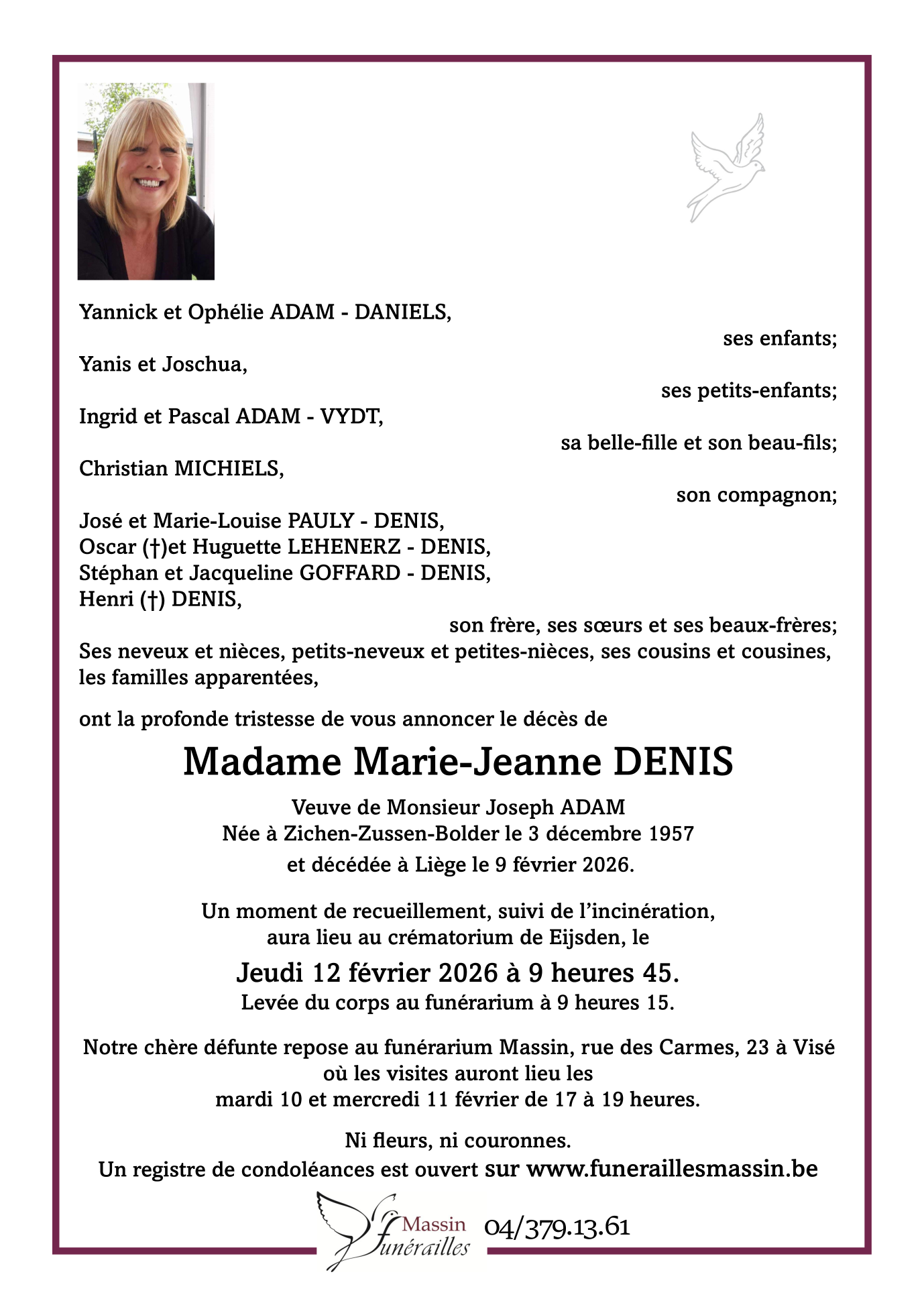Née à Zichen-Zussen-Bolder (3770) le mardi 3 décembre 1957