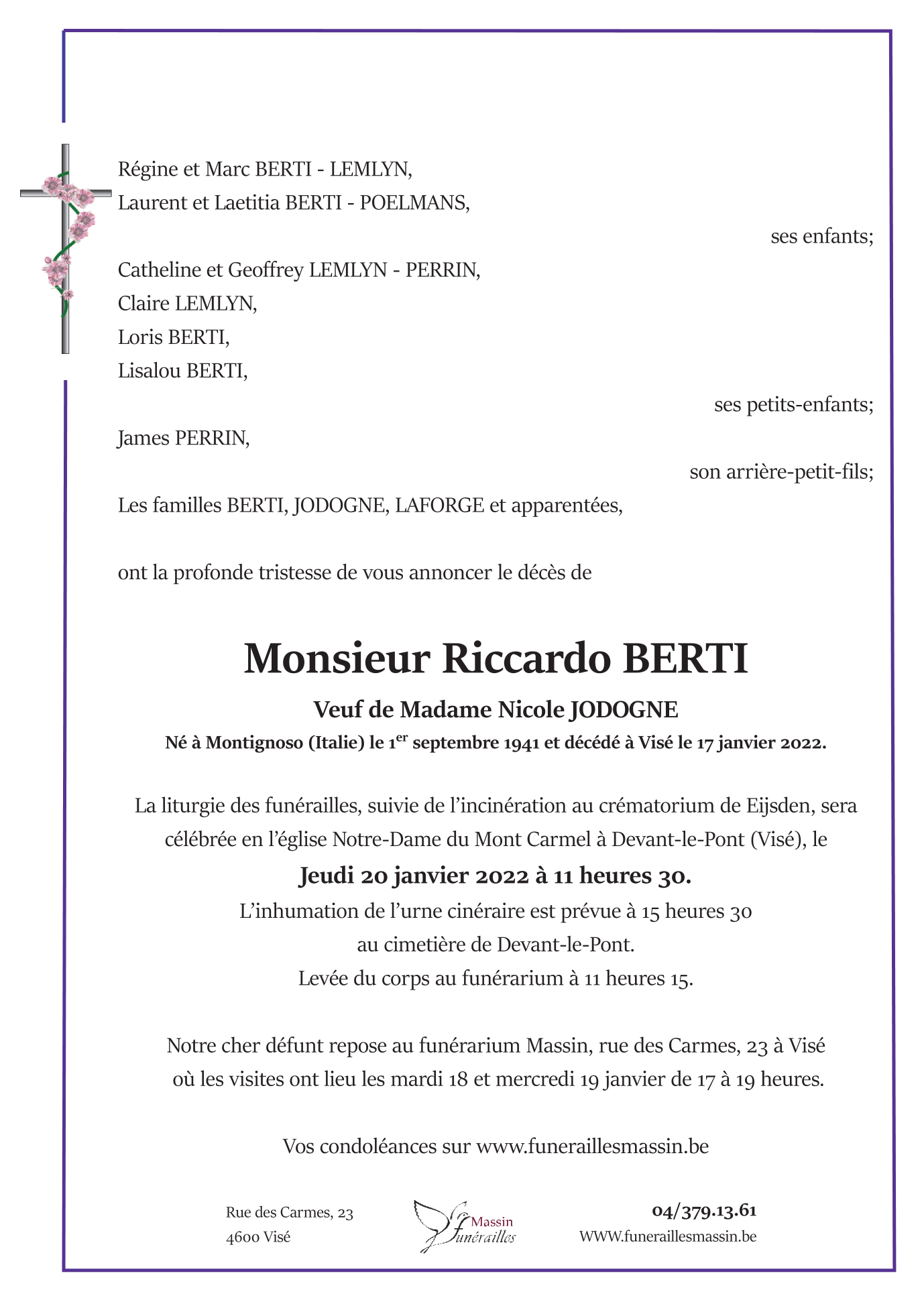 Décédé à Visé (4600) le lundi 17 janvier 2022 à l'âge de 80 ans