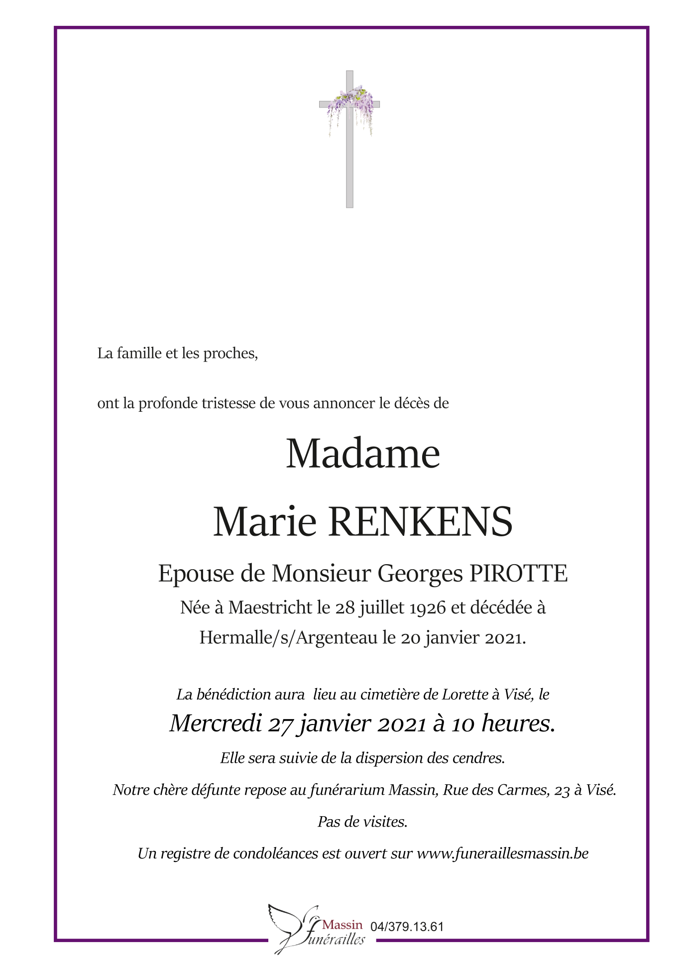 Décédée à Hermalle-sous-Argenteau (4681) le mercredi 20 janvier 2021 à l'âge de 94 ans