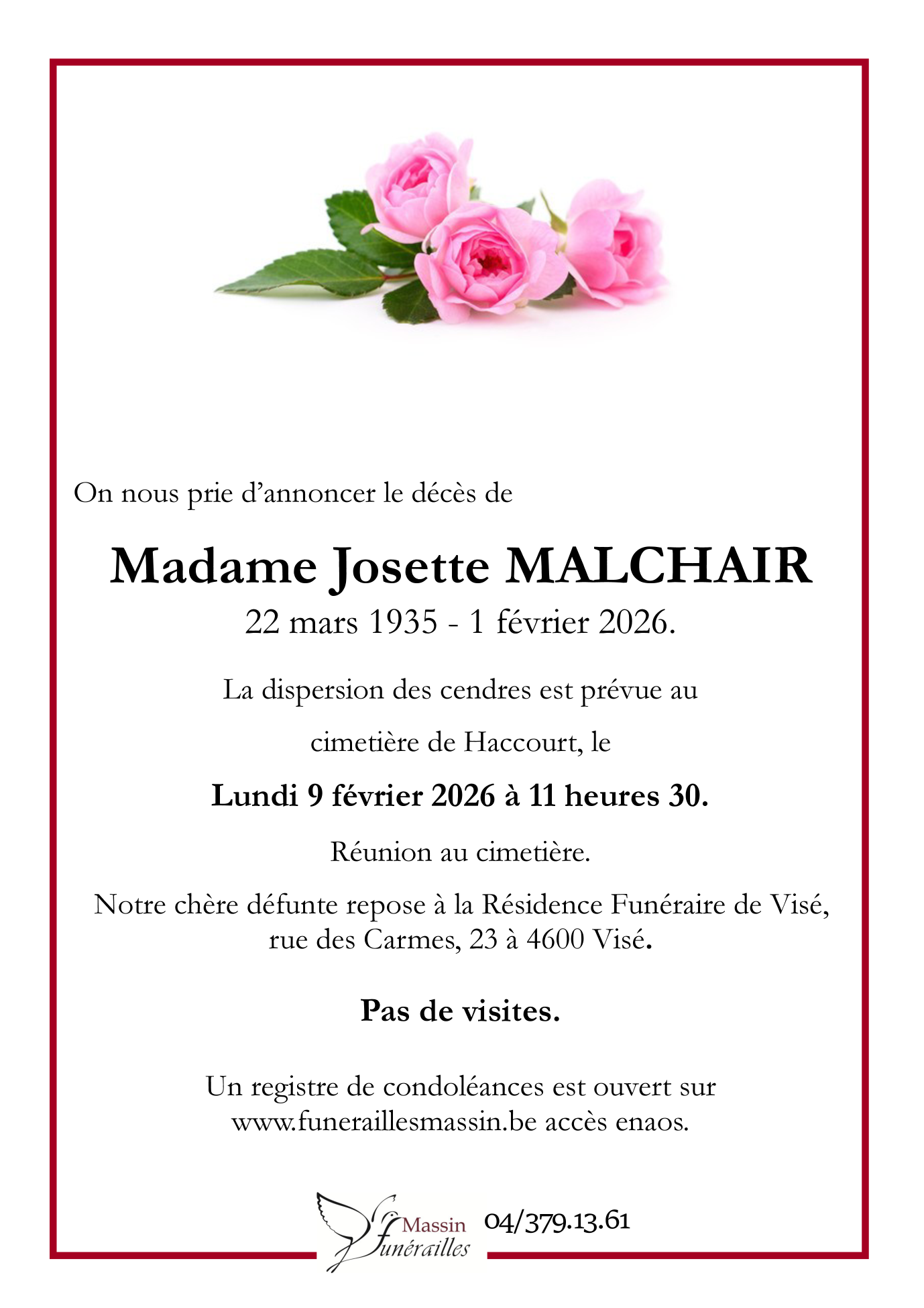 Décédée à Hermalle-sous-Argenteau (4681) le dimanche 1 février 2026 à l'âge de 90 ans