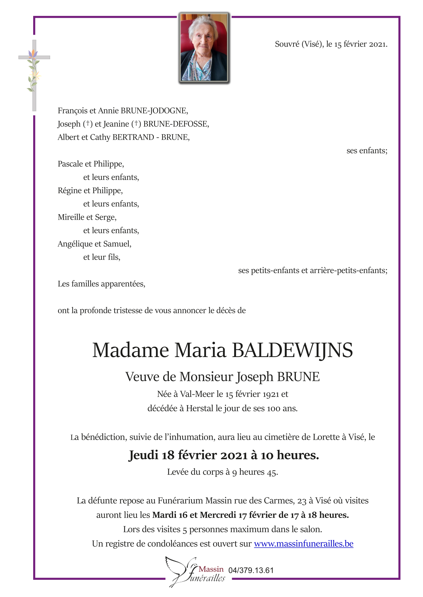 Décédée à Herstal (4040) le lundi 15 février 2021 à l'âge de 100 ans