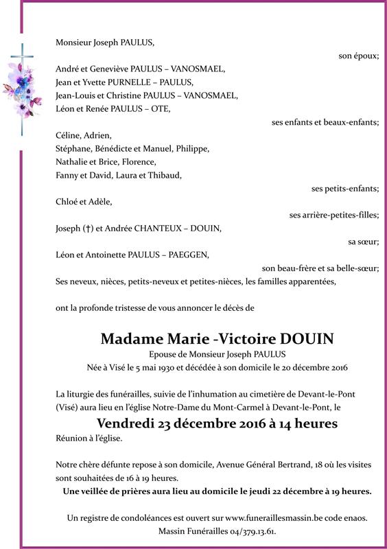 Décédée à Visé (4600) le mardi 20 décembre 2016 à l'âge de 86 ans