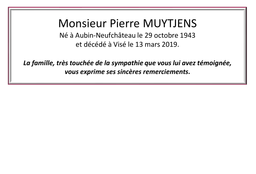 Décédé à Visé (4600) le mercredi 13 mars 2019 à l'âge de 75 ans